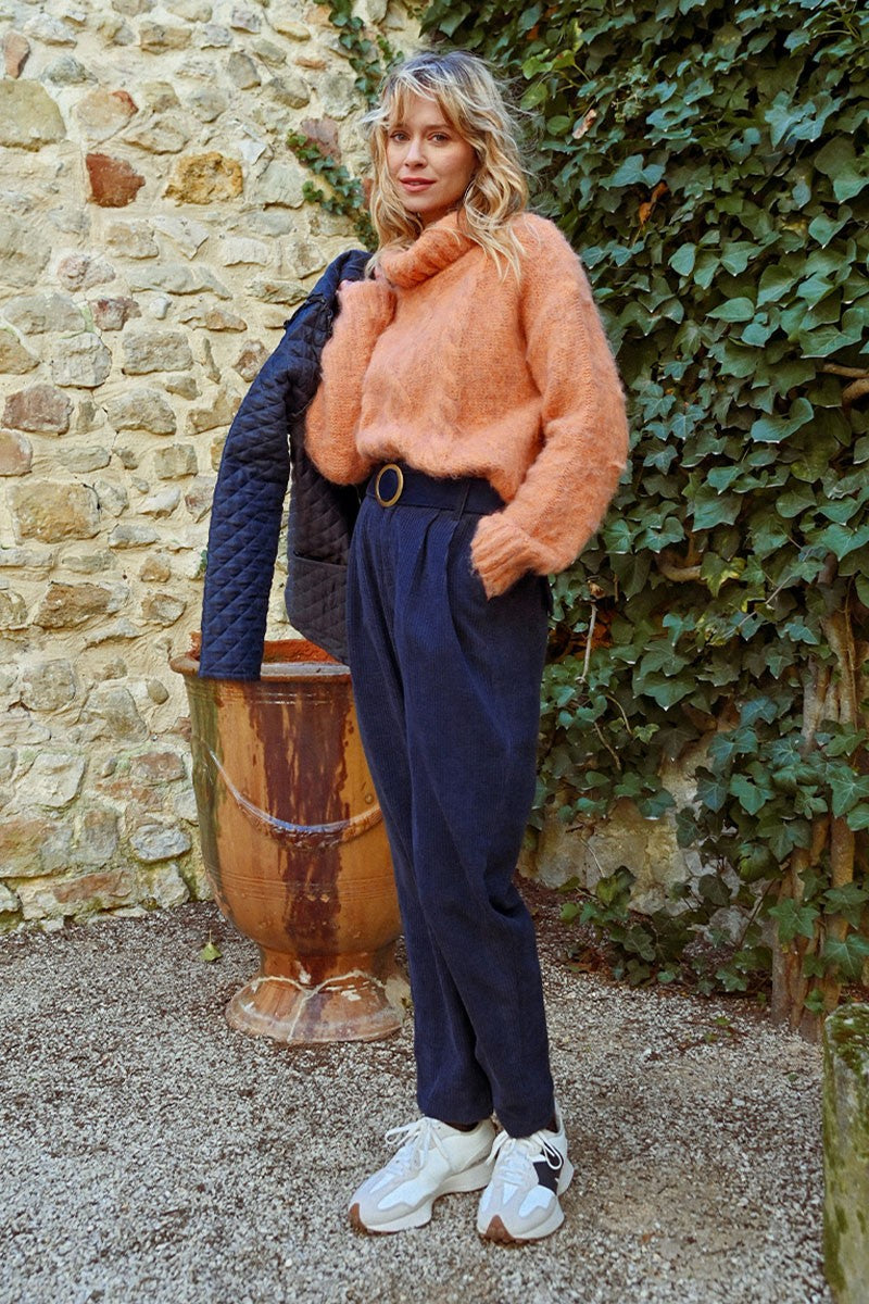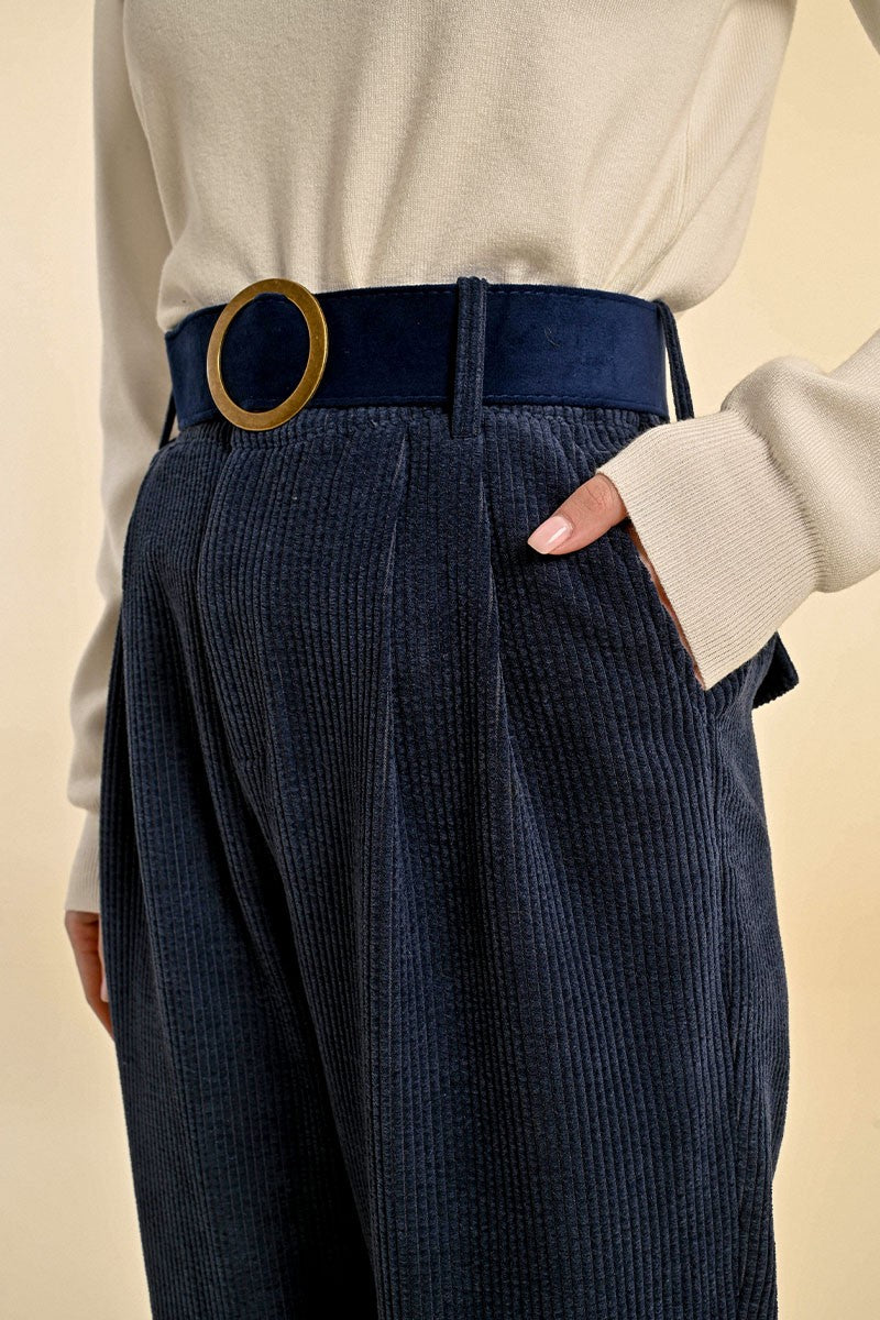 -Corduroy pants-Balloon shape-Wide removable belt with contrasting buckle-Darts in the middle of the front-Side pockets-Back pocket with flap-Side length 100 cm (for size S)